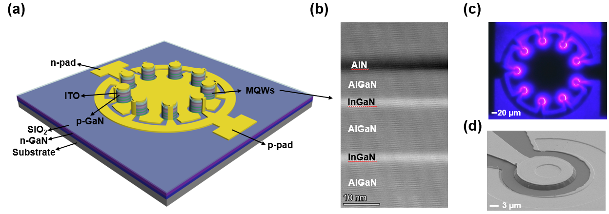 随着人工智能大模型训练、高性能计算与数据中心内部流量的爆炸式增长,传统基于铜线的电互连在带宽密度和能耗上面临严峻瓶颈。光互连技术因其高带宽、低延迟、抗电磁干扰等优势,是高速互连的解决方案。在这一背景下,研究兼具高调制带宽、高集成度、低成本的光源成为关键。近日,复旦大学智能机器人与先进制造创新学院田朋飞课题组与合作团队在紫光micro-LED高速通信研究中取得系列重要进展,分别通过环状并联micro-LED和低串扰空间分复用micro-LED阵列,实现了单通道10.25 Gbps和多通道19.3 Gbps的高速可见光通信速率,为发展高密度、高通量光互连传输芯片奠定了坚实基础。