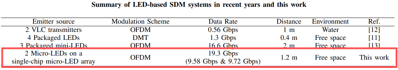 为大幅提升总互连速率,有效的途径是采用空间分复用(SDM) 技术,即在同一芯片上集成多个并行发射通道,通过设计非共n型阵列,提高了micro-LED阵列抗串扰能力。基于2颗micro-LED的SDM系统,实现了单通道9.58 Gbps和9.72 Gbps的速率,总速率高达19.3 Gbps,这是迄今为止LED-based SDM-VLC系统的最高纪录,为集成上百个通道的Tbps级光通信芯片指明了方向。