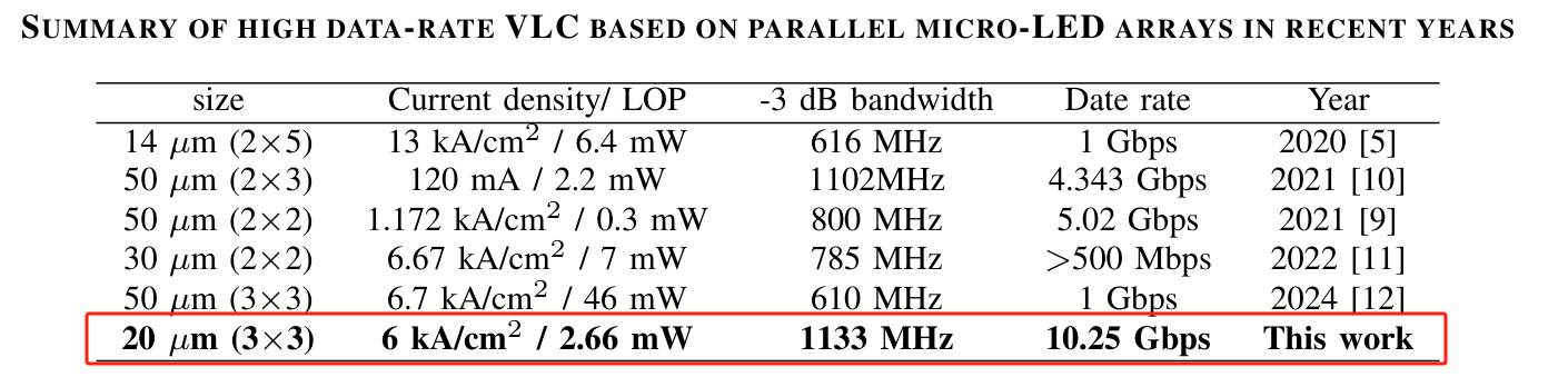 复旦大学田朋飞课题组与苏州纳米所徐科课题组合作,在外延结构势垒层中引入AlN/AlGaN,具有更好的载流子限制特性,并设计了环状并联结构的紫光micro-LED阵列,为实现高带宽奠定了基础。9像素并联阵列的-3 dB带宽高达1133 MHz,高于单颗micro-LED的797 MHz。结合OFDM调制技术,该并联micro-LED最终实现了单通道10.25 Gbps的传输速率记录。