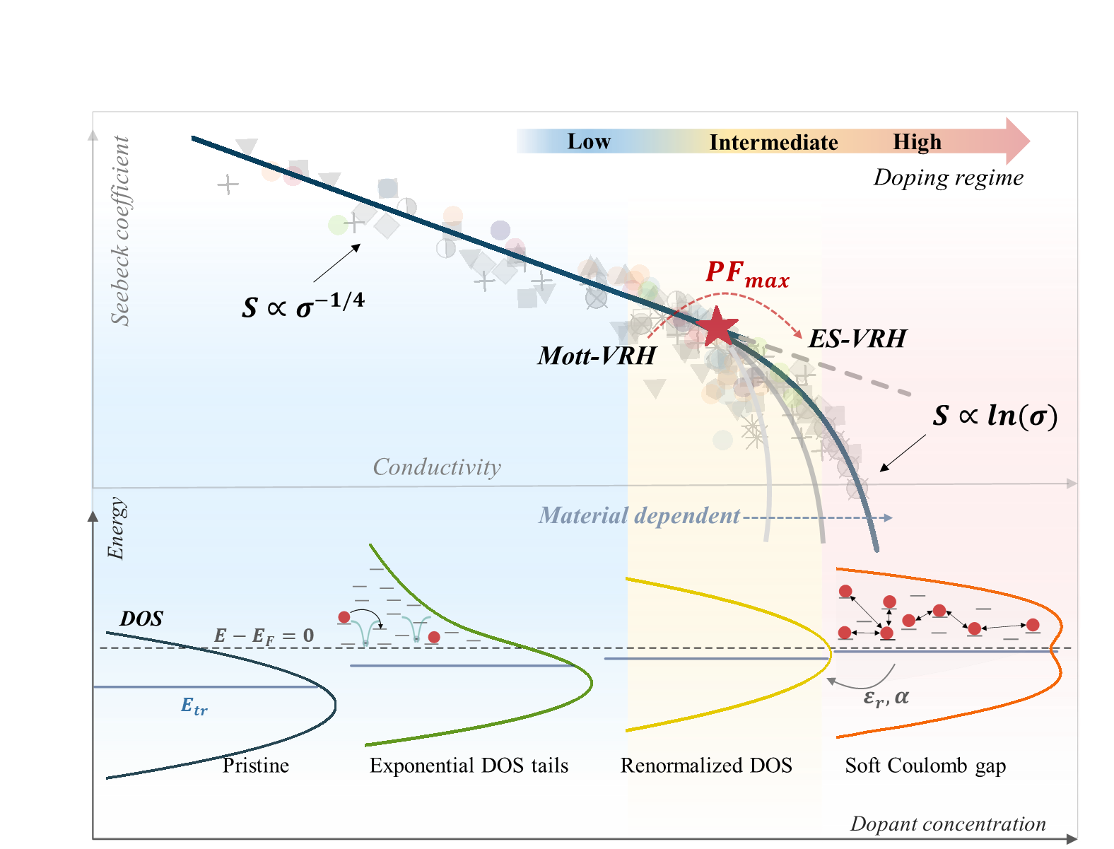 Figure 5. Doping-driven evolution of the density of states (DOS) and its impact on the Seebeck-conductivity (S-σ) correlation. As doping concentration increases, the DOS progressively evolves from an intrinsic Gaussian distribution to the formation of exponential tails, then transitions into a renormalized DOS, and ultimately develops into a Coulomb-gap feature. This DOS transformation is directly reflected in the corresponding S-σcorrelation. The shaded symbols indicate the experimental data presented in Figure 2.