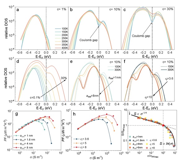 Figure 4.Kinetic Monte Carlo simulations of density of states (DOS) and thermoelectric behavior. (a-c) kMC-calculated evolution of the DOS as a function of temperature at different hole concentrations: (a) 1%, (b) 10% and (c) 30%. (d) DOS evolution as a function of hole concentration (1% to 30%) at 300 K. (e) DOS evolution as a function inter-site distance () ranging from 1nm to 8 nm, simulated at 100 K and 300 K. (f) Evolution of DOS as a function of relativedielectric constant () from 3.6 to 8 nm, simulated at 100 K and 300 K. (g-h) Thermoelectric characteristics from kMC simulations at varying parameters for (g) aNN=1 nm, 1.8 nm, 4 nm and 8 nm; and (h) εr= 3.6, 5 and 8. (i) Normalized Seebeck coefficient versus conductivity based on the simulation results in panels (g) and (h).Default kMCsimulation parameters(unless otherwise specified): aNN = 1.8 nm, σDOS= 75meV,ν0 = 1×1013 s-1,εr =3.6, from 100 K to 400K. For DOS calculations in (a-c), the same input parameters as in Figure 3d were used.