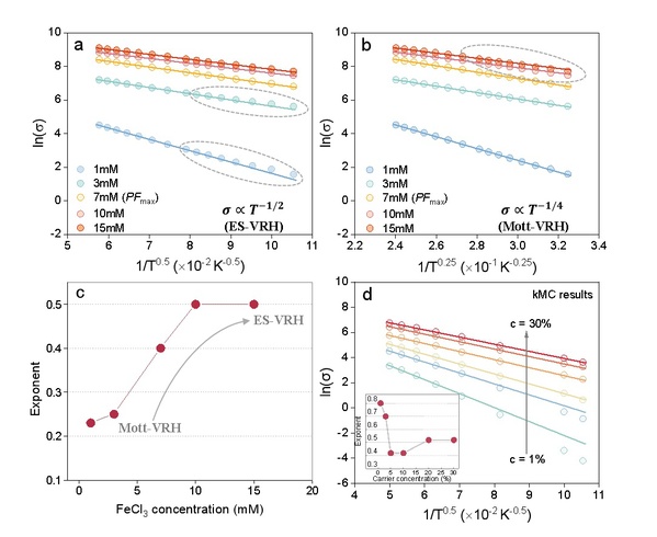 Figure 3. Temperature-dependent conductivity in experiments and simulations.(a-b) Experimental plots of logarithmic conductivity as a function of temperaturefor material PBBSe-H at different FeCl3 concentration, showing characteristic temperature exponent 0.5 and 0.25, respectively. (c) Extracted optimal hopping exponent as a function of FeCl₃ concentration, indicating a clear transition from Mott-VRH (α~0.25) to ES-VRH (α~0.5) transport with increasing doping level. (d) Kinetic Monte Carlo (kMC) calculations of logarithmic conductivity as a function of temperature at differenthole concentration.Default kMC parameters: inter-site distance aNN = 1.8 nm, energetic disorder σDOS= 75meV, attempt-to-hop frequency ν0= 1×1013 s-1, relativedielectric constant εr =3.6, temperature from 100 K to 400K. Lines are fits to ln(σ)∝T-0.5. Circles in panels (a) and (b) highlight nonlinear fits corresponding to Mott-VRH and ES-VRH regimes at different doping levels.