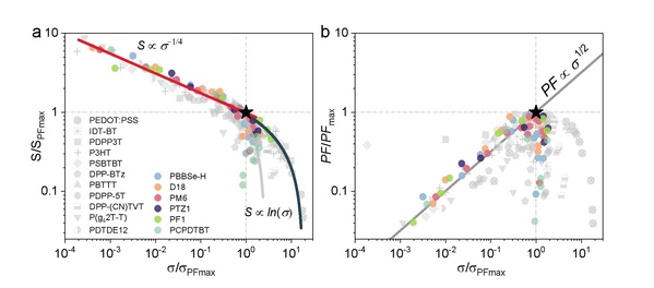 Figure 2. (a)Normalized Seebeck coefficient (S/Smax) and (b) normalized power factor (PF/PFmax)as a function of conductivity (σ/σmax) for all studied polymers. Both the Seebeck coefficient (S) and conductivity (σ) are normalized to their respective values at maximum power factor. The star symbol represents the maximum PF (PFmax) All data are derived from the measurements presented in Figure 1.Solid lines are trend lines following the indicated functional form.