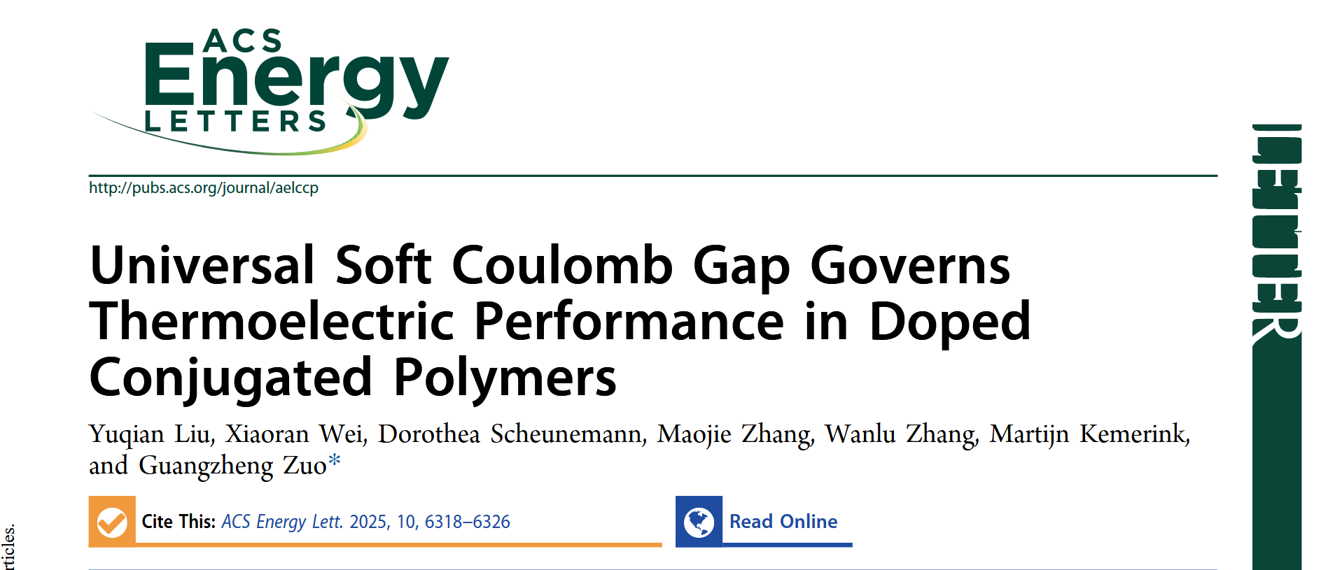 Yuqian Liu, Xiaoran Wei, Dorothea Scheunemann, Maojie Zhang, Wanlu Zhang, Martijn Kemerink and Guangzheng Zuo*. Universal Soft Coulomb Gap Governs Thermoelectric Performance in Doped Conjugated Polymers. ACS Energy Letters, 2025, 10, 6318-6326.