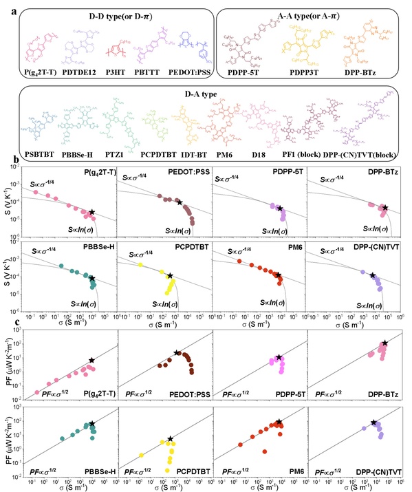 Figure 1. (a) Chemical structure of the studied materials in this work, representing diverse backbone designs including donor–donor, donor–acceptor, acceptor–acceptor, and copolymer architectures.(b) Experimental Seebeck coefficient-conductivity (S-σ) curves and (c) Corresponding power factor (PF) as a function of conductivity for representative polymersunder p-type doping conditions. P(g42T-T), PEDOT:PSS, PDPP-5T, DPP-BTz, PBBSe-H, PCPDTBT, PM6, DPP-(CV)TVT.