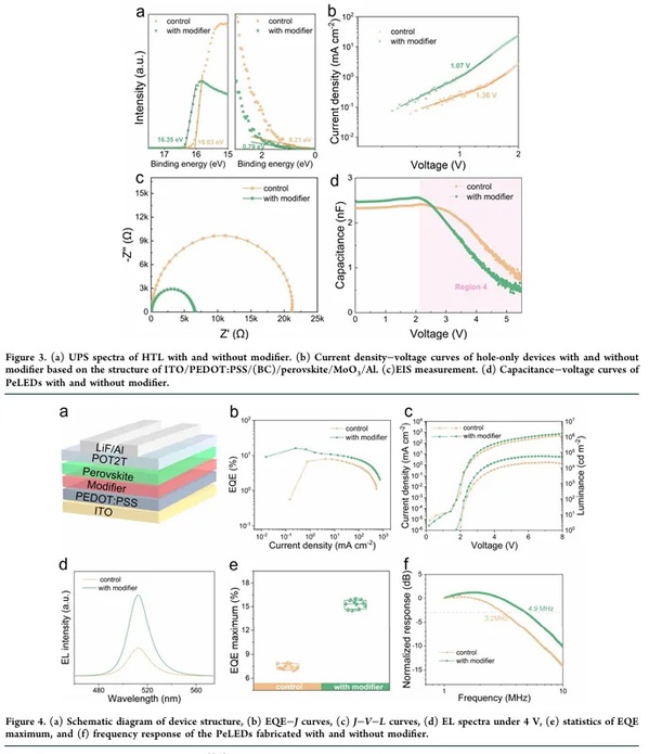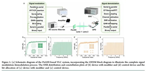 复旦大学郭睿倩、田朋飞、梅时良等人提出采用两性离子甜菜碱柠檬酸盐的多功能界面修饰策略,可同步实现缺陷钝化与电荷注入平衡。该分子通过与Pb²⁺配位降低陷阱密度,通过与PEDOT:PSS的离子相互作用降低空穴注入势垒,结合甲醇处理提升界面接触性与导电率。这些协同效应有效抑制非辐射损耗并降低RC时间常数。最终器件实现4.9 MHz调制带宽与55.56 Mbps数据传输速率,在同类器件中创下最佳性能纪录。该工作揭示了界面工程对提升可见光通信性能的重要作用,为发展基于钙钛矿发光二极管的高速可见光通信提供了可行路径。