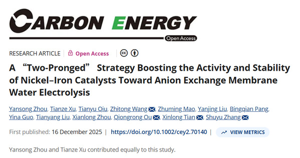 复旦大学张树宇&区琼荣,海南大学田新龙&王志同等人提出了一种基于“双重策略”的NiFe析氧电极构筑路线,通过等离子体改性基底增强催化剂与基底之间的相互作用,从而提高电极在高电流密度析氧条件下的机械稳定性;同时引入有机磷配位保护层,有效抑制Fe活性位在强氧化电位下的电化学溶解,并促进氧析出反应动力学。该成果以“A ‘Two‐Pronged’ Strategy Boosting the Activity and Stability of Nickel-Iron Catalysts Toward Anion Exchange Membrane Water Electrolysis”为题发表在Carbon Energy 上。