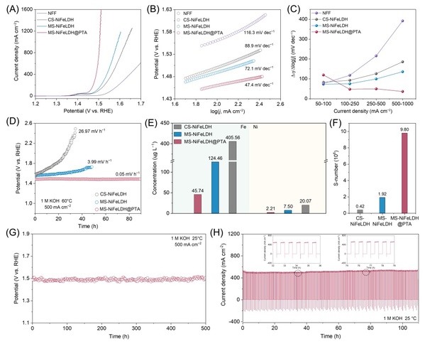 三电极电化学测试结果表明,MS-NiFeLDH@PTA在OER反应中具有优异的大电流密度下的催化性能;通过加速老化测试、长期稳态运行及间歇启停测试证明MS-NiFeLDH@PTA阳极在苛刻工况下仍表现出良好的稳定性;与S-number描述符相关联的定量测试结果进一步表明等离子体基底改性结合有机磷修饰的双重保护策略显著提升了所制备NiFe基阳极的OER活性和稳定性。