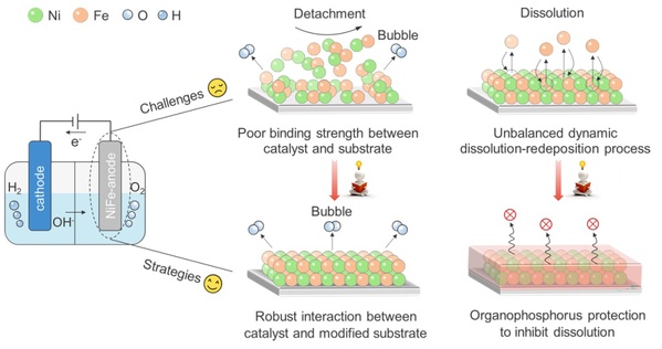 NiFe基OER电极在AEMWE中面临两大核心失效机制:催化剂与基底结合力弱导致机械脱落;高氧化电位下Fe活性位发生电化学溶解。本工作针对上述挑战提出“双重策略”设计理念:通过增强催化剂–基底界面稳定性与催化剂–电解质界面稳定性,实现高效稳定OER。
