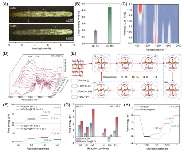 微米划痕测试量化并证实等离子体改性显著增强催化剂–基底结合力;原位Raman与原位ATR-SEIRAS揭示了PTA修饰促进了Ni(Fe)OOH活性相的产生,并通过调节AEM反应路径的决速步能垒优化OER反应动力学;DFT计算表明PTA修饰显著提高了Fe位点的溶解势垒,实现稳定性与活性的协同优化。