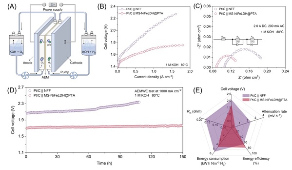 MS-NiFeLDH@PTA阳极与商用铂碳阴极配对在AEMWE器件中仅需1.70 V槽压便可实现1 A cm−2电流密度;原位阻抗测试表明该电极对在工况下具有更低的电荷转移电阻与传质阻抗;在80°C、1 A cm-2下长期稳定运行150 h;与商业NiFe泡沫对比,体现出显著的性能优势。